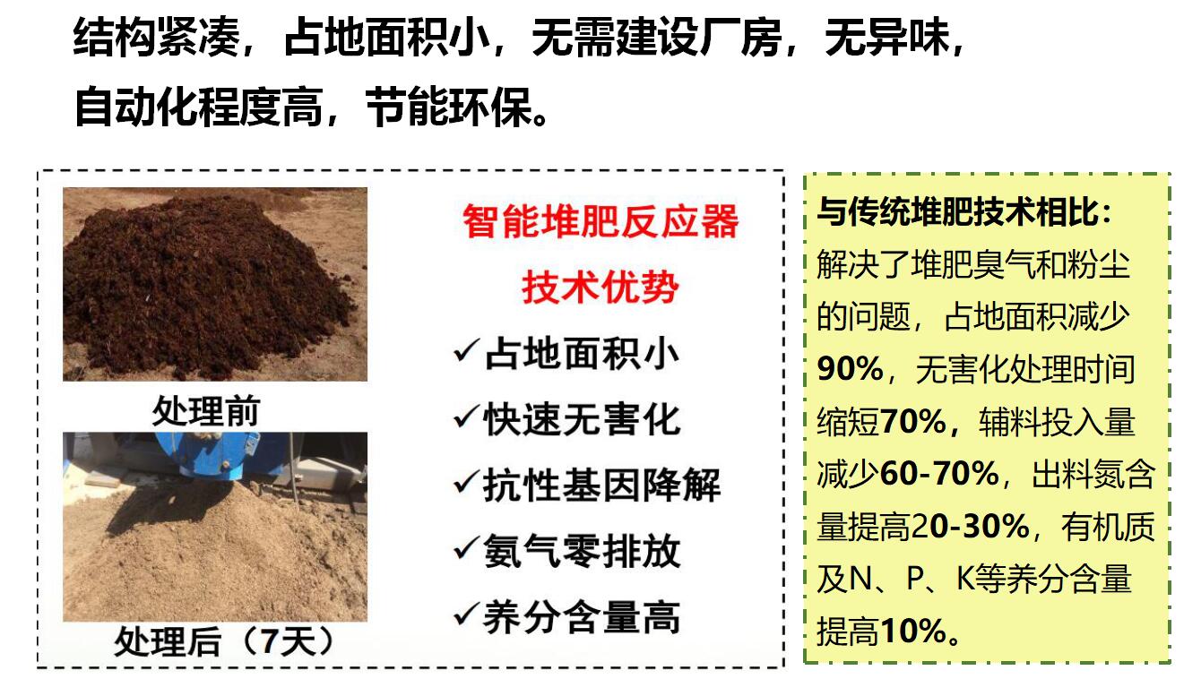 畜禽糞便有機肥發(fā)酵罐將儲存和處理過程合二為一,通過調(diào)氧控溫、理化固氮和微生物降解,實現(xiàn)畜禽糞尿處理時間縮短70% ,氨氣揮發(fā)減少53%,養(yǎng)分含量提高15%-20%,抗生素及抗性基因降解率超過90%。
